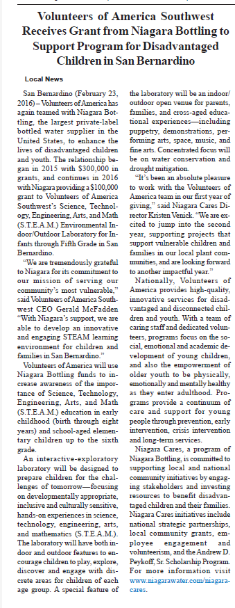 Volunteers of America has teamed again with Niagara Bottling, the largest private-label bottled water supplier in the United States, to enhance the lives of disadvantaged children and youth. The relationship began in 2015 with $300,000 in grants, and continues in 2016 with Niagara providing a $100,000 grant to Volunteers of America Southwest's Science, Technology, Engineering, Arts, and Math (S.T.E.A.M.) Environmental Indoor/Outdoor Laboratory for Infants through Fifth Grade in San Bernardino.
